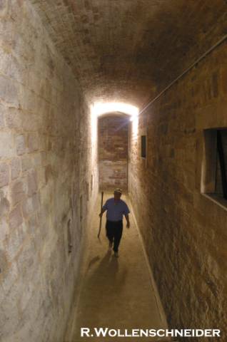 Es war eben die Zeit, in der man noch mit Eisenkugeln schoss, mit Sturmleitern die Wallmauer bezwang und mit Säbeln aufeinander einschlug. Innerhalb der Poterne entdeckt der Besucher in beiden Wänden breite, tiefe gemauerte Einkerbungen zum Einlegen von Balken. Diese, den Gang sperrenden Hindernisse sollten einem eingedrungenen Feind das weitere Vordringen erschweren. Der Raum mit dem Ausfalltor ist ringsum mit schmalen Schiessscharten versehen, um im Falle eines Angriffs den Feind auch innerhalb der Festung bekämpfen zu können. All dies ist aber nie zur Ausführung gekommen, denn die Festung Rastatt ist nie von den Franzosen belagert worden. Die einzige Belagerung war vom 01.Juli 1849 bis zum 22.Juli 1849 und zwar durch die Preußen. Doch das ist eine Geschichte für sich.