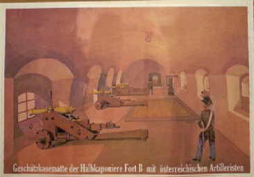 Zurückgekehrt in den Vorraum, öffnen wir eine weitere Stahltür und betreten die sogenannte CAPONIERE 27. Diese reine Geschützstellung mit ihren 12 Kanonen lag wie ein Sperrriegel quer im Festungsgraben und sorgte dafür, dass dieser feindfrei blieb.