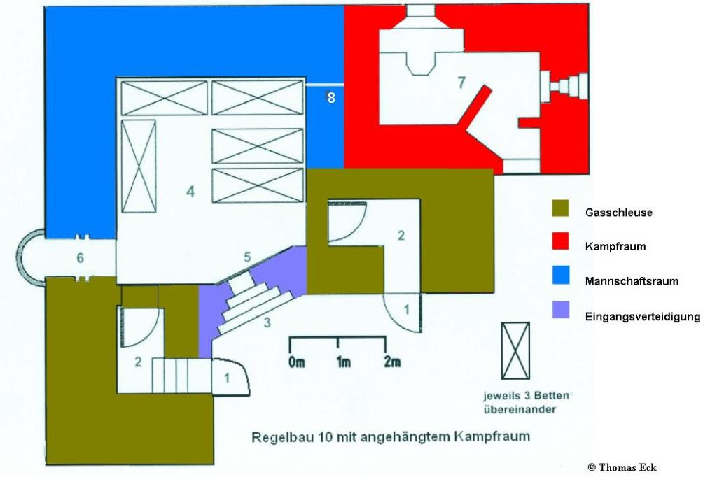 Um in den angehängten Kampfraum (7) zu gelangen, musste der Bunker verlassen werden. Einzige Verbindung zwischen Mannschafts- und Kampfraum bestand durch ein Sprachrohr (8). Der Kampfraum selbst hatte keinen Gasschutz.