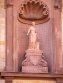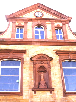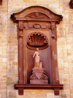 Abertausende von Passanten haben sie im Vorbeigehen unbewusst gesehen, die Buntsandsteinskulptur. Aber kaum einer hat sich wohl je einen Gedanken darüber gemacht, um wen es da oben an der Rückseite des historischen Rathauses handelt. Dort findet sich hinter einem Taubenschutzgitter in einer Nische, einer griechischen Göttin neben einem Altarstein gleich, eine schlanke Gestalt. Ihr fehlen Finger der rechten Hand, sieht man genauer hin.