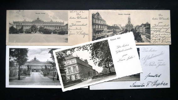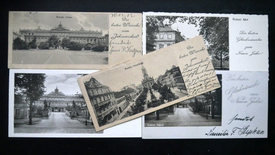 Bereits um 1910 wurden Ansichtspostkarten im Miniformat versandt. Im Format 14 x 6 Zentimeter wählte man für die Neujahresgrüße die Motive der Rastatter Barockresidenz und den Blick auf die Stadtkirche St. Alexander. Damals genügte ein Porto von drei Pfennig, dass das ungewöhnliche Format versandt wurde.
