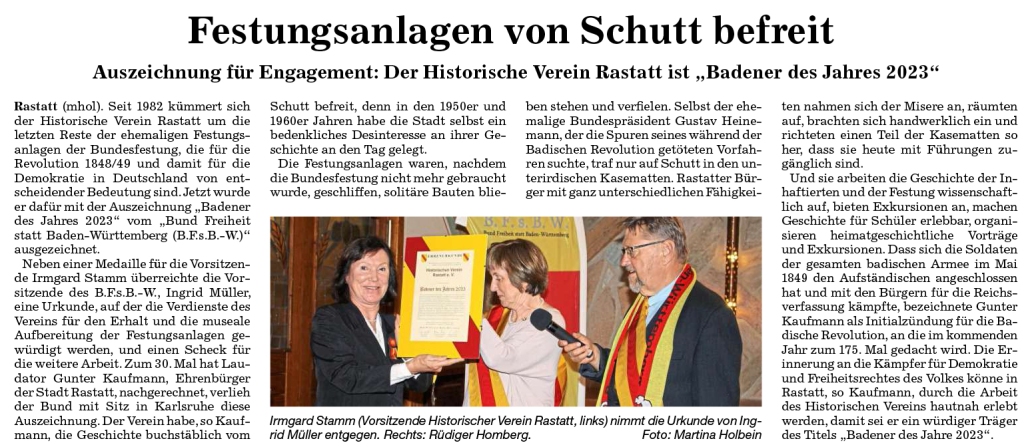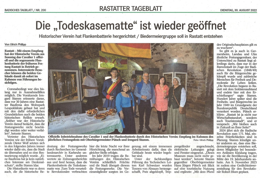Karlsruhe/Rastatt. Am vergangenen Wochenende (28.09.) konnten der Historische Verein Rastatt und die KulturRegion Karlsruhe rund dreißig Denkmal’schätze‘ zu einem Ausflug in die Rastatter Vergangenheit be-grüßen. Ausgangspunkt waren die unterirdischen Ka-sematten der Bastion 27 der ehemaligen Bundesfes-tung Rastatt. „Was uns verbindet, ist der ehrenamtliche Einsatz für den Erhalt und die gesellschaftliche Vermitt-lung unseres Kulturerbes“, erinnerte Dieter Wolf, der erste Vorsitzende des Historischen Vereins, zu Beginn an den Hintergrund des regionalen Austausches. Denn alle gehörten zu den Bewerbern für den Kulturpreis der TechnologieRegion Karlsruhe unter dem Motto „Denk-mal’schätze‘ gesucht“. Angesprochen waren die vielen ehrenamtlichen Akteure in der Denkmalpflege. Als ei-ner der vier Preisträger hatte sich der Historische Ver-ein Rastatt bereit erklärt, sein „Pflegekind“ einmal in dieser Runde vorzustellen. Im Frühjahr konnte sich die Gruppe bereits beim ersten Preisträger, dem Forum Gernsbacher Zehntscheuern, ein eigenes Bild von de-ren Vereinsarbeit machen. Die Initiative für dieses er-neute Netzwerktreffen ging von der KulturRegion Karls-ruhe aus, die auch das Konzept und die Organisation des Kulturpreises verantwortet hatte. Nach einem herz-haften „zweiten Frühstück“ führte Dieter Wolf die Gäste mit eindrücklichen Schilderungen durch die Räume der ehemaligen Rastatter Festung, die vom Historischen Verein über die Jahre wieder freigelegt wurden. Im An-schluss konnten sich die Teilnehmer oberirdisch noch einer ebenso fachkundigen, historischen Stadtführung von Oliver Fieg vom Rastatter Stadtarchiv anschließen.